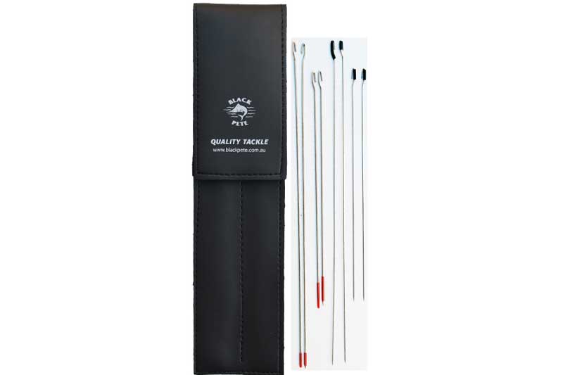 Stainless steel live bait needles to cover a range from medium to heavy tackle & contained in a handy synthetic leather pouch. These live bait needles have a conical point & a bridling loop closure sleeve.
