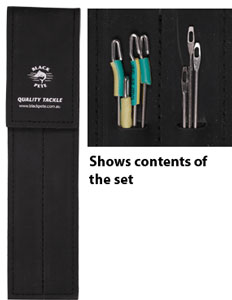 Stainless steel live bait & stitching needles to cover a range from medium to heavy tackle & contained in a handy synthetic leather pouch. The stitching needles have a conical point & flattened eye. The live bait needles have a conical point & a bridling loop closure sleeve.