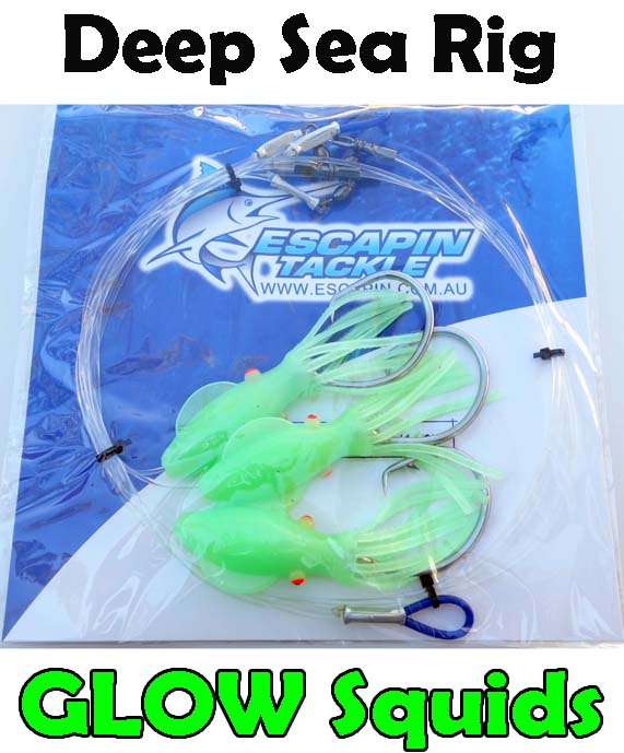 This rig is made from 350lb Jap Grade Mono Leader, 3 x Stainless Steel 14/0 Tuna Circle Hooks and Ultra Glow Squid. It will easily handle a 15-20kg fish.