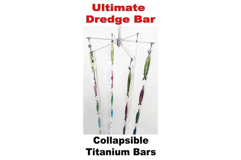 18" Collapsible Titanium 6 armed Dredge bar, rigged with 6 holographic ballyhoo strips each containing 8 fish. (total 48 fish). The strips are double laminated with towing eye grommet & clip for easy attachment. Each strip is 210cm in length.