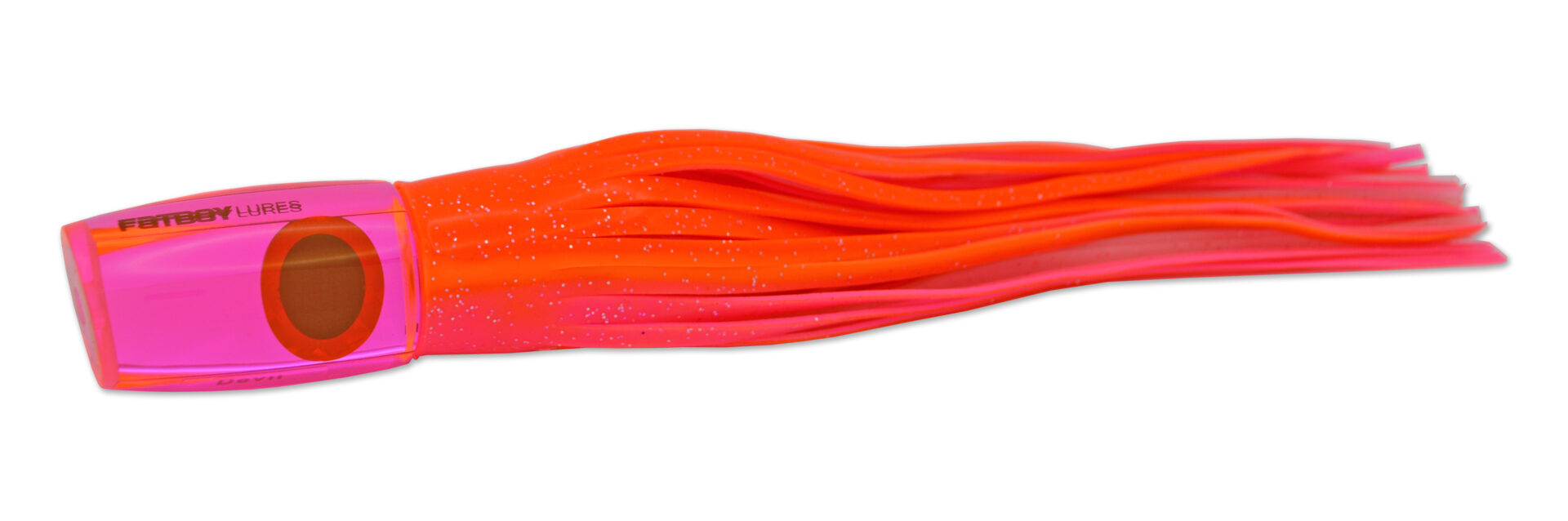 The FatBoy Lures Devil is a slant-face, short plunger-style design with a gentle angle and moderate taper, which gives a consistent and reliable action that works well across all sea conditions. A very stable and easy to use slant design that pumps out a strong bubble trail. The Devil is keel-weighted (both sizes) for perfect balance and true running performance. Versatile enough to be used from any position in the spread, though we recommend the short and long rigger, or shotgun, as the best positions to try it.