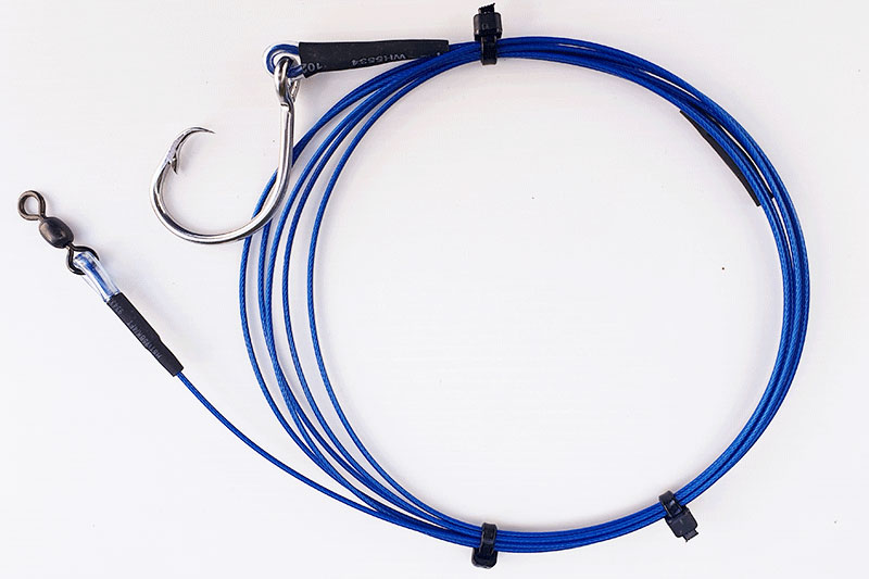 This rig is made from stainless steel 650lb 316ss Nylon coated wire and a 13/0 stainless circle hook.